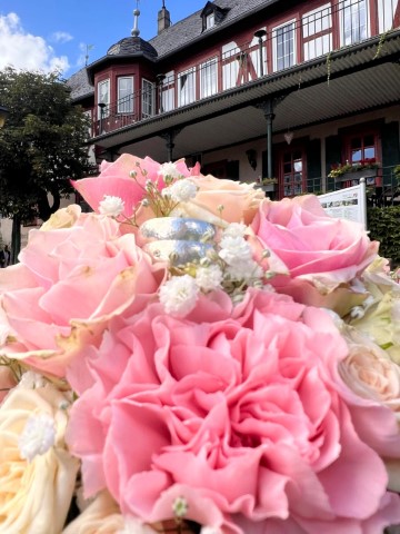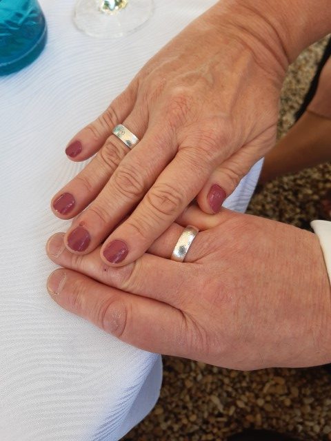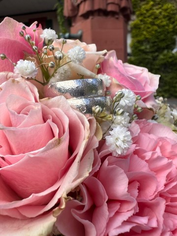 Das zweite Paar in meinem Freundeskreis, dass sich gefunden hat, um die zweite Hochzeit zu feiern, wählte Silber, mit gehämmerter Oberfläche; jeder Schlag bringt eine kleine Delle 😉. Diese Ringe sind etwas breiter. Bei dem Damenring ist mittig ein apricotfarbiger Brillant in eigeriebener Fassung gesetzt worden und für die Gravur wurde eine klassische Schreibschrift ausgesucht.