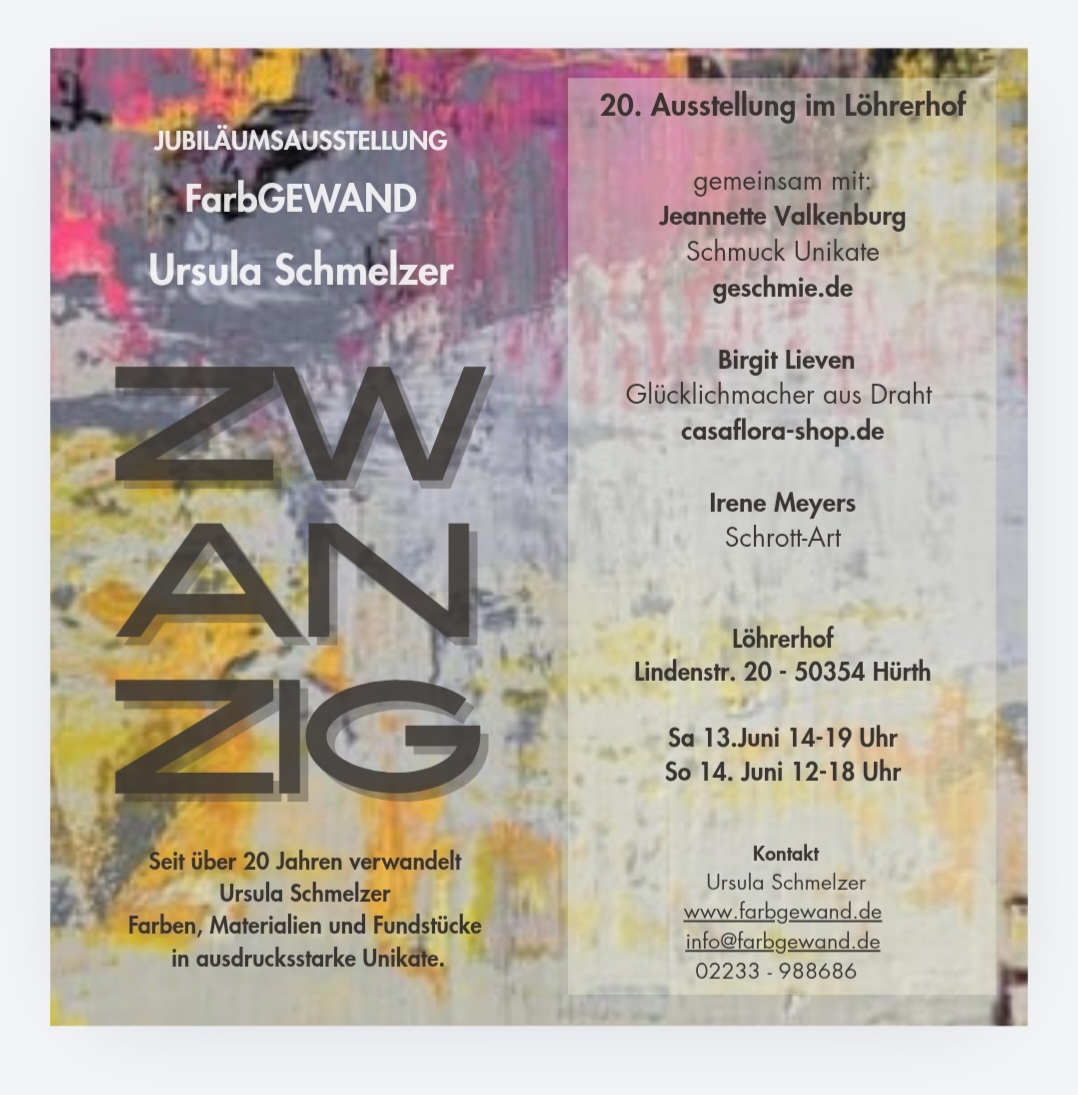 Kaum ist die ManufakTOUR im Mai vorüber, findet im Juni in Hürth die Jubiläumsausstellung von Uschi Schmelzer statt. Auch in diesem Jahr werde ich als Gastausstellerin dabei sein, zusammen mit zwei weiteren Künstlerinnen.