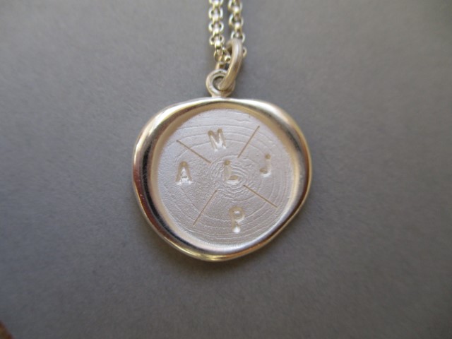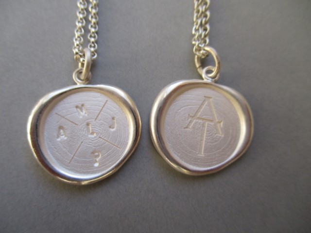 Meine Schmucketuies werden immer mit einem Siegel versehen. Während ich auf einer Schatulle mein Siegel in das geschmolzene Wachs drückte, kam mir der Gedanke, dass diese Form sich auch ganz wunderbar als Kettenanhänger eignen würde. Nach mehrfachen Tests, geschmolzenes Wachs auf eine Folie zu tropfen und eine glatte, runde Fläche einzudrücken, hatte ich ein Siegel, dass mir in der Form gut gefiel. Diese Wachsform habe ich in die Gussanstalt geschickt und dort eine duplizierbare Form sowie die ersten Abgüsse herstellen lassen. Die Struktur, die beim Eindrücken des kalten Metalls in das warme Wachs enstand, ist in jedem Abguss sichtbar.