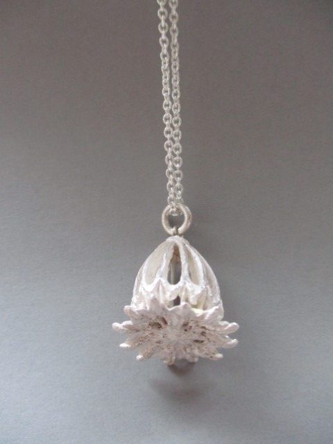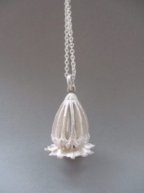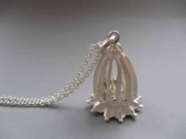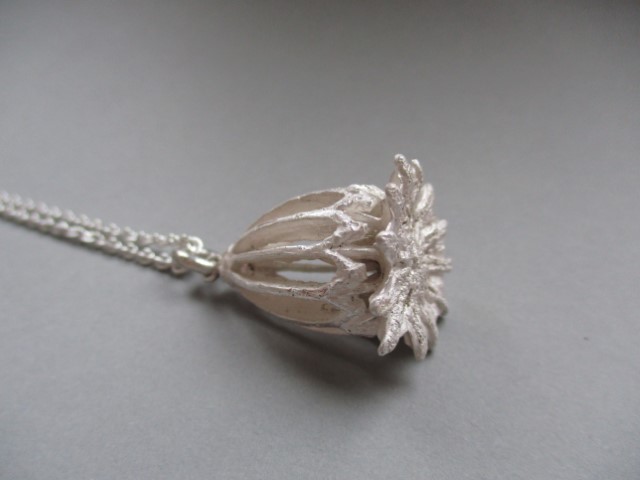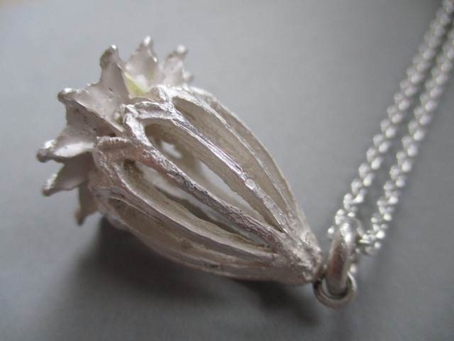 Ein neuer Anhänger aus der skelletierten Kapsel einer großen Mohnblüte in 935/1000 Silber ist fertig geworden.